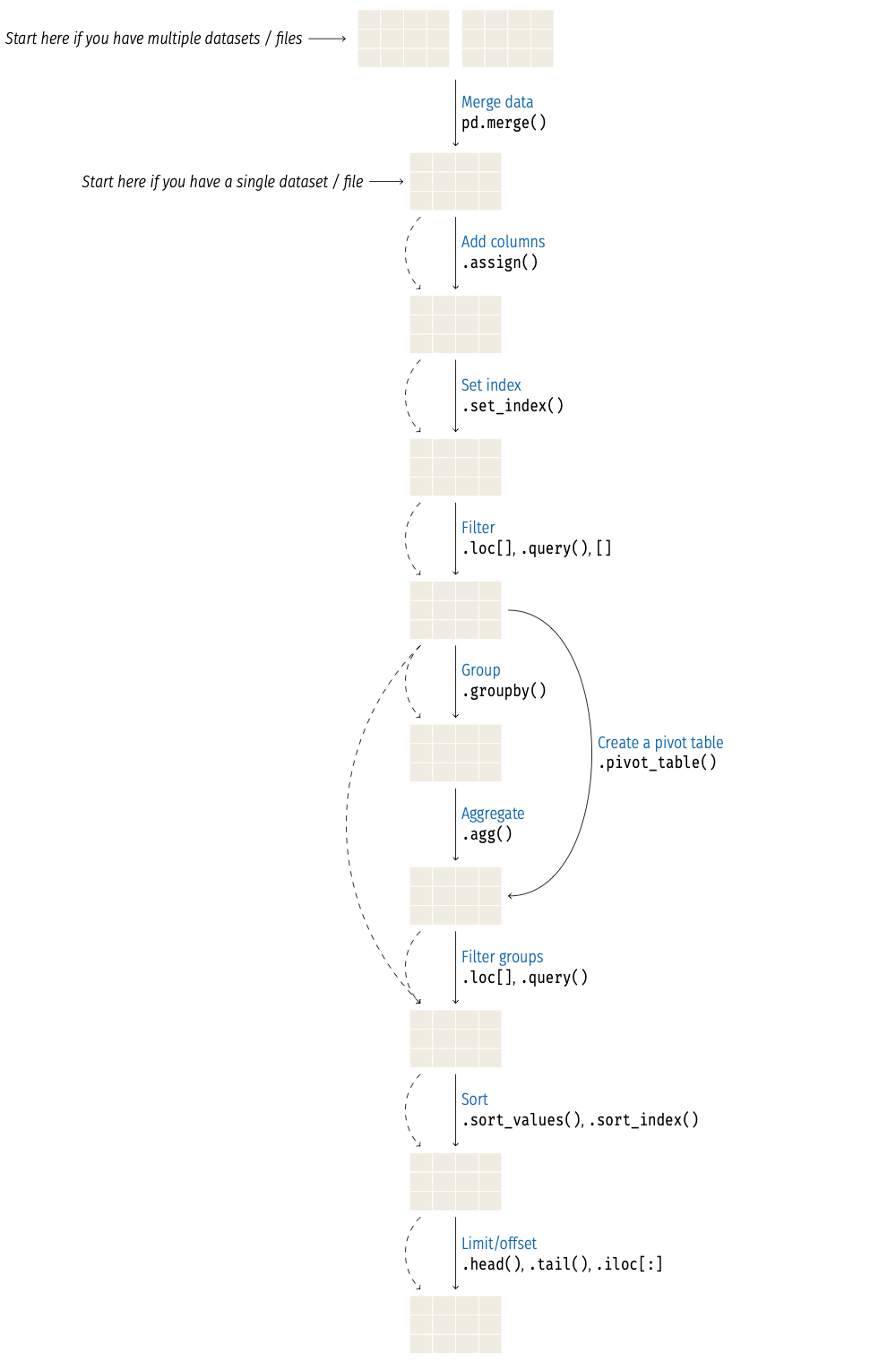 The framework is flexible, steps can be combined, reordered, or repeated depending on the analysis. Many operations return new DataFrames, so method chaining is common: